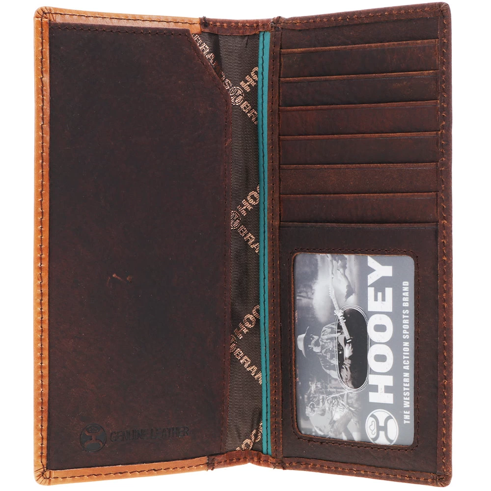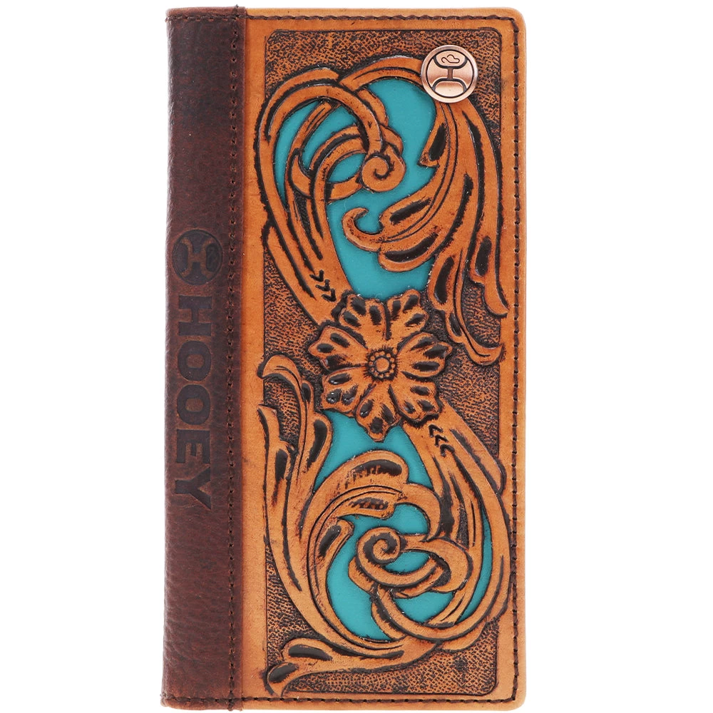 This Hooey rodeo wallet features hand-tooled leather detailed with Turquoise inlay, Tan exterior & interior, and includes our custom hooey brands woven logo liner.