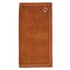 This Hooey bifold money clip wallet features Distressed Shrunken Grain Leather with Hand tooled filigree spine overlay , Brown/Tan exterior & interior and includes our custom hooey brands woven logo liner.
