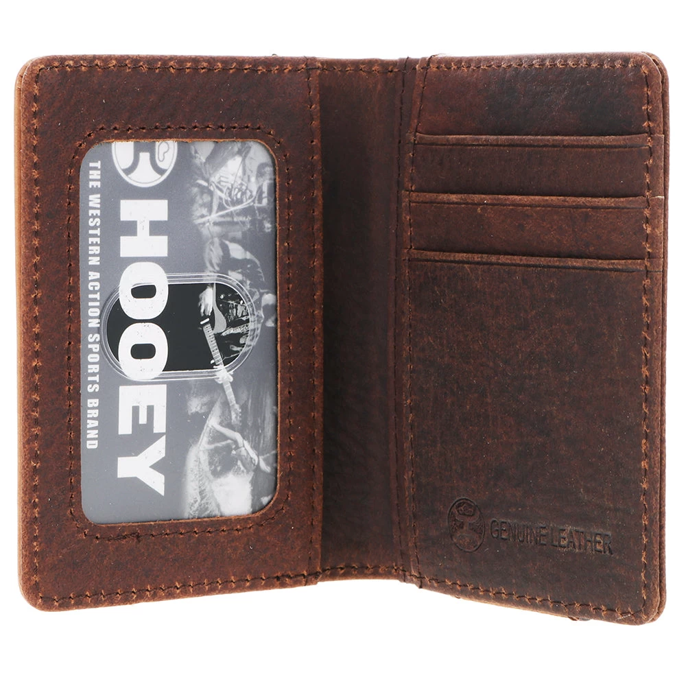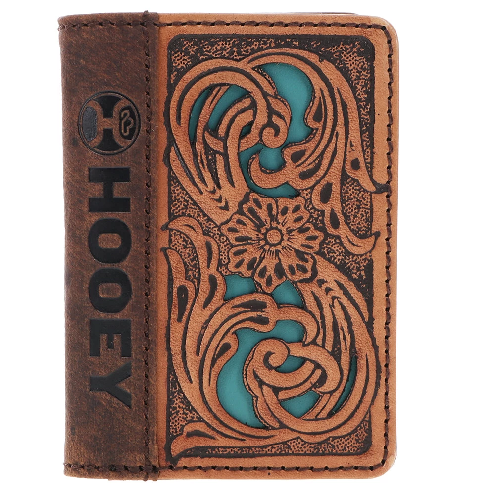 This Hooey bifold money clip wallet features hand-tooled leather detailed with Turquoise inlay, Tan exterior & interior, and includes our custom hooey brands woven logo liner.