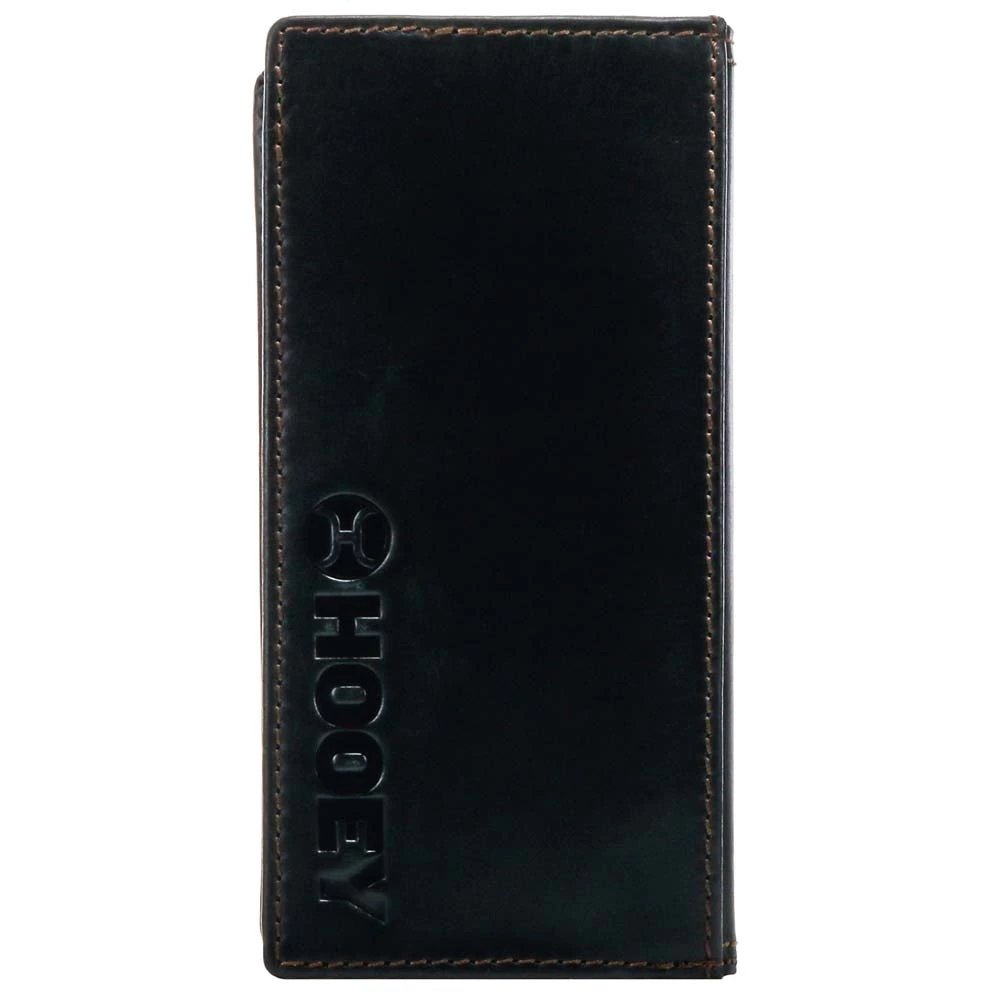 This Hooey rodeo wallet features a smooth black exterior and interior with a brown double-stitched accent edge and includes our custom hooey brand woven logo liner.