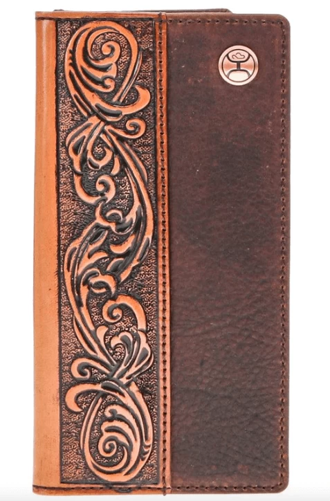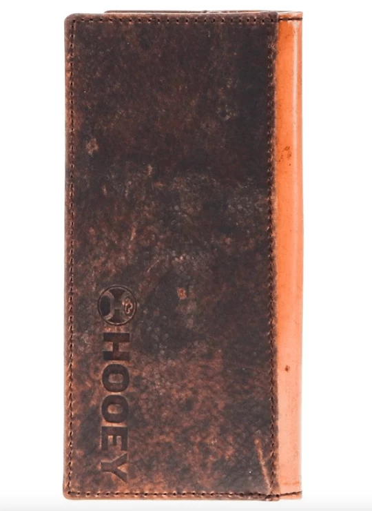 This Hooey rodeo wallet features Distressed Shrunken Grain Leather with Hand tooled filigree spine overlay , Brown/Tan exterior & interior and includes our custom hooey brands woven logo liner.