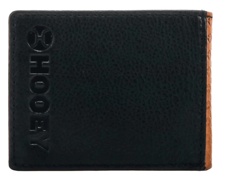 This Hooey front pocket bifold wallet features a basket weave detailed exterior and black interior with black leather corner overlay and includes our custom hooey brand woven logo liner.