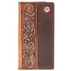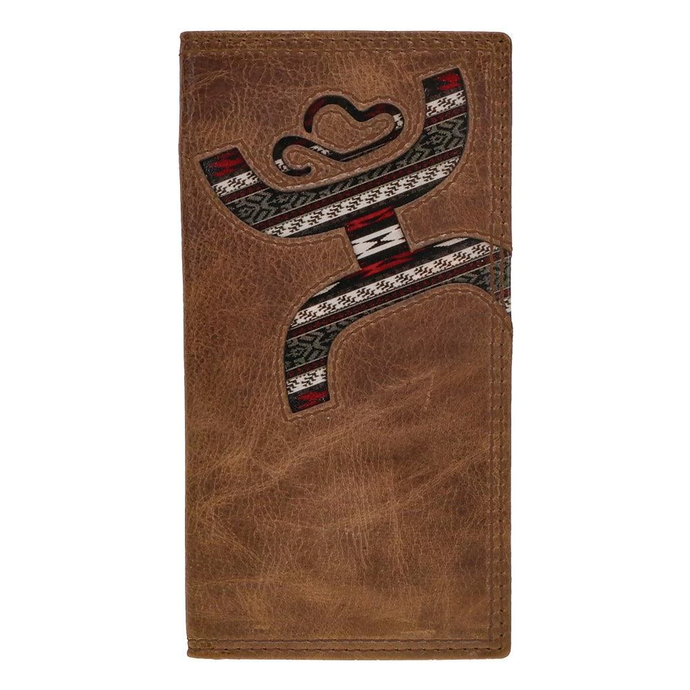 This Hooey rodeo wallet features a laser cut hands-up Hooey Logo, detailed with nomad print inlay exterior and tan interior, and includes our custom hooey brands woven logo liner.