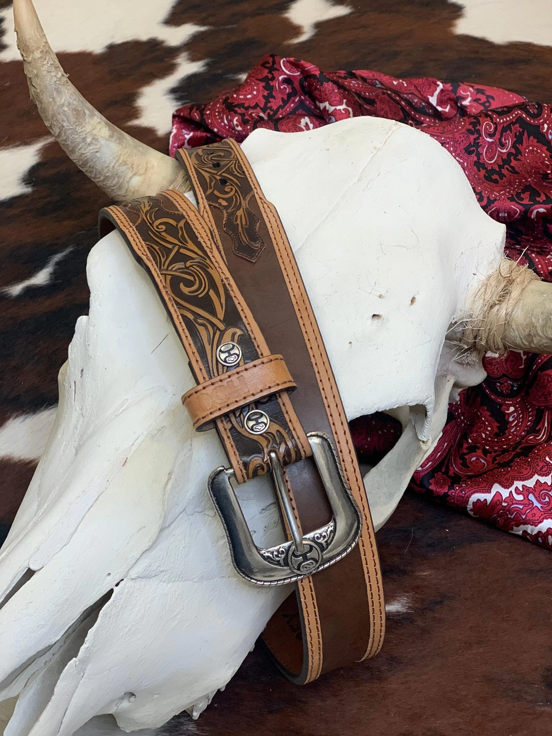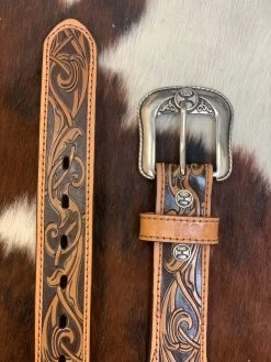 This Hooey classic men’s belt features brown distressed leather, detailed filigree billets with natural double welt accent edge.