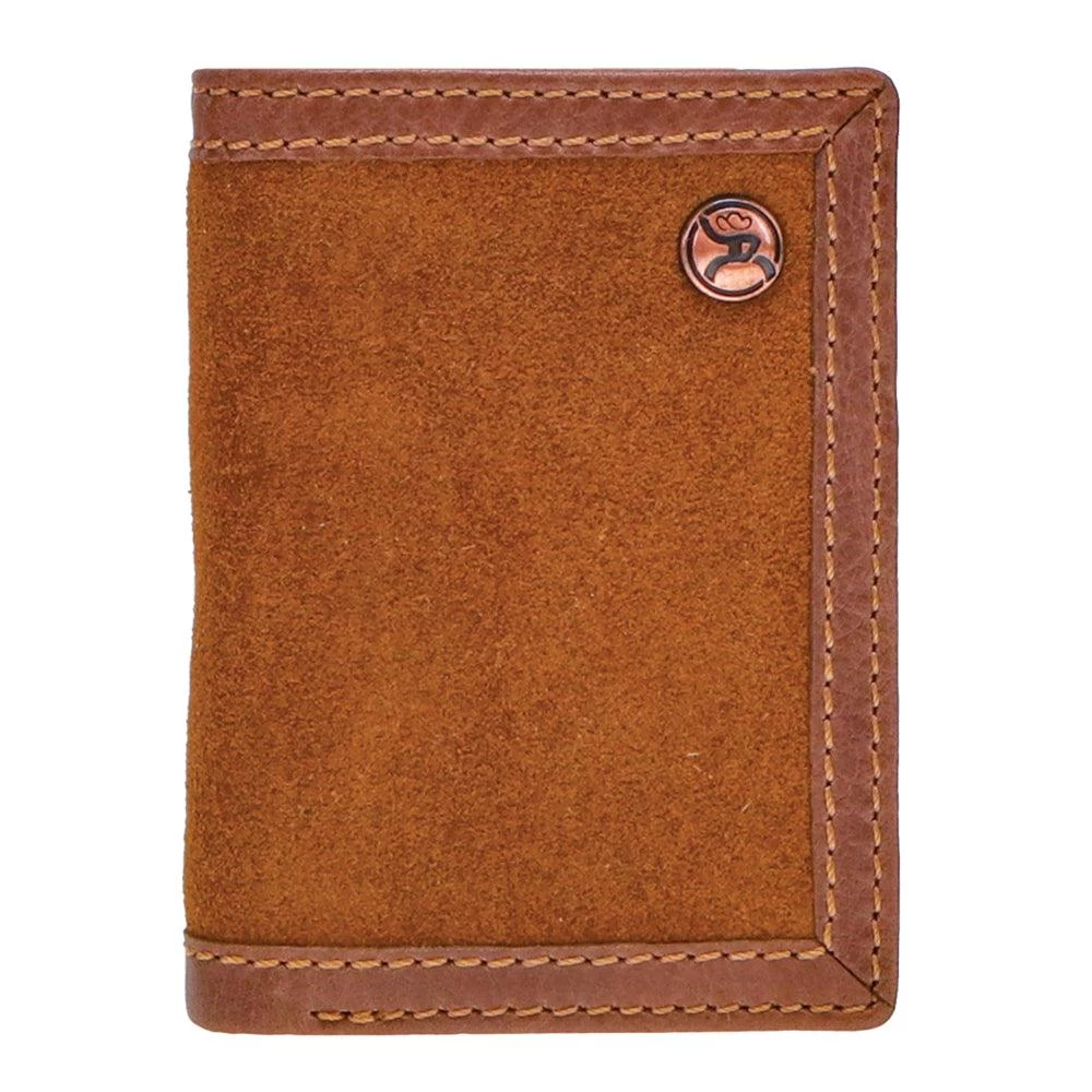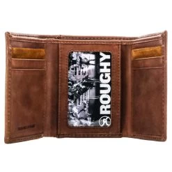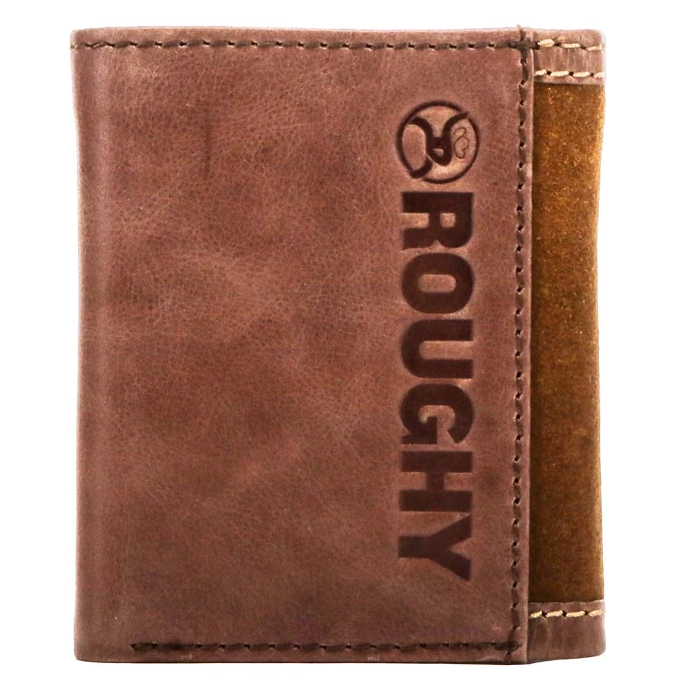 This Roughy trifold wallet features roughout brown exterior and brown interior leather with double welted edge and includes our custom hooey brands woven logo liner.