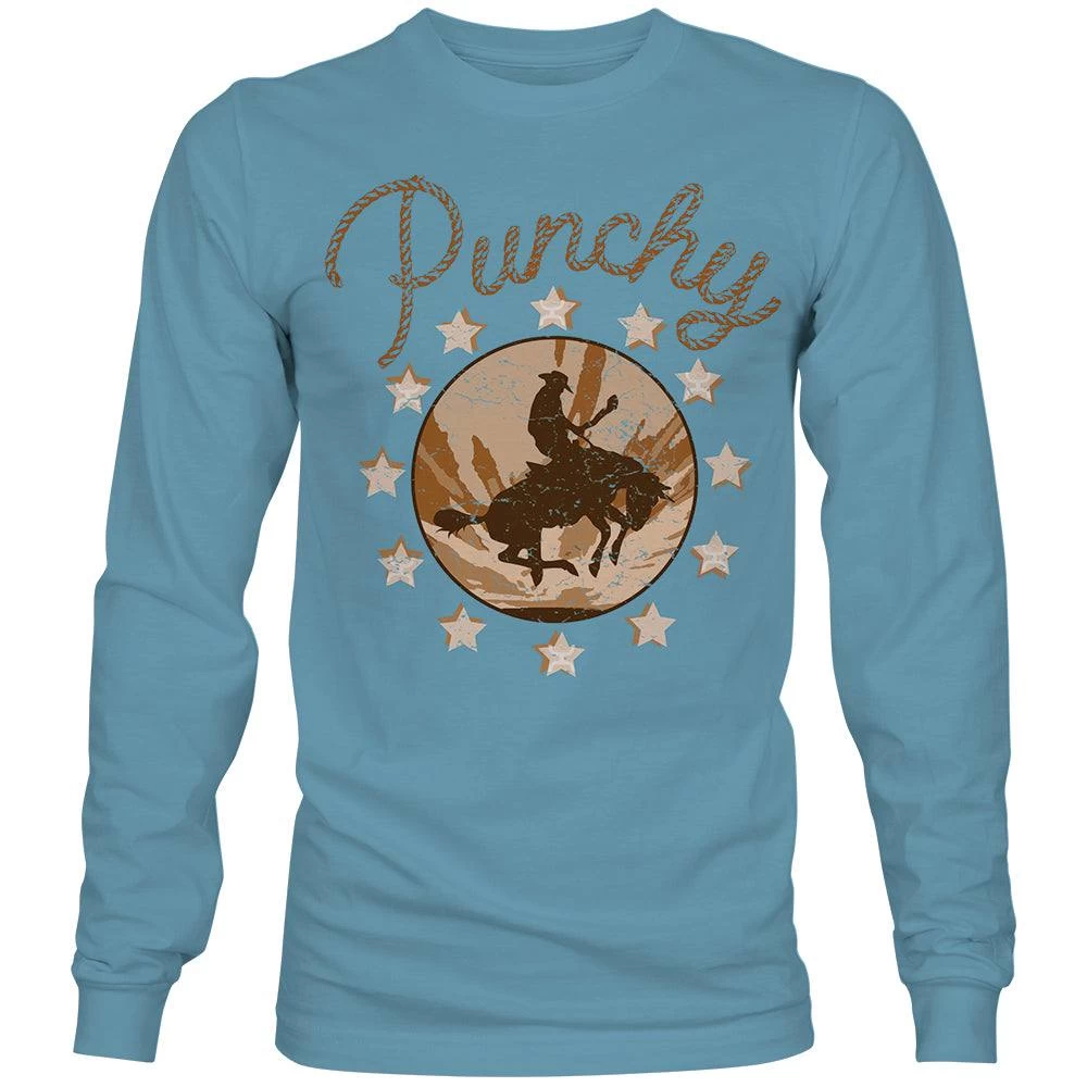 This Tan/Cream Punchy Logo Denim Blue Long Sleeve T-shirt comes in youth sizes and provides a stylish, comfortable look.